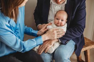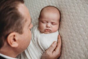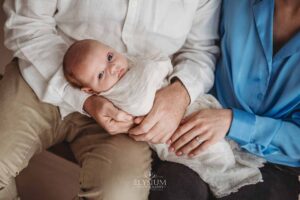 The session unfolded gently, with warm cuddles, tiny stretches, and those fleeting newborn expressions that disappear almost as quickly as they arrive. Piper nestled into her parents’ arms like she’d always belonged there, and the whole room carried that peaceful, love‑soaked stillness that only a newborn can bring.